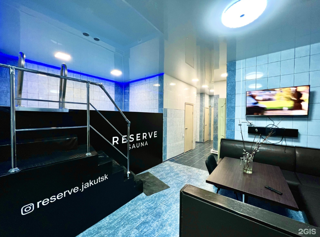 Объект носит название «Reserve sauna» и располагается по адресу Орджоникидзе, 28, в том же здании, что и спорткомплекс, со входом с торца. В перечень услуг входят бассейн, финская парная и комната для двоих, оборудованная двуспальной кроватью.