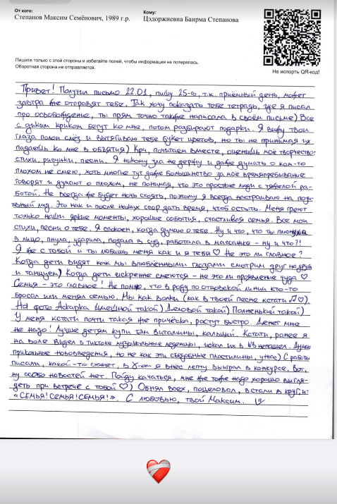Также женщина выложила любовное письмо от мужа. В нем он пишет: «Так хочу показать тебе тетрадь, где я писал про освобождение, ты прям точно так же написала в своём письме. Все с диким криком бегут ко мне, потом разбирают подарки. Я вижу твои глаза, полные слёз и протягиваю тебе букет цветов, но ты, не принимая их, падаешь ко мне в объятия. Короче, почитаем вместе, оценишь мое творчество: стихи, рисунки, песни. Я ни на кого зла не держу и даже думать о ком-то плохо не смею. Меня греют только наши яркие моменты, хорошие события, счастливая семья. Все мои стихи, песни о тебе. Я спокоен, когда думаю о тебе».