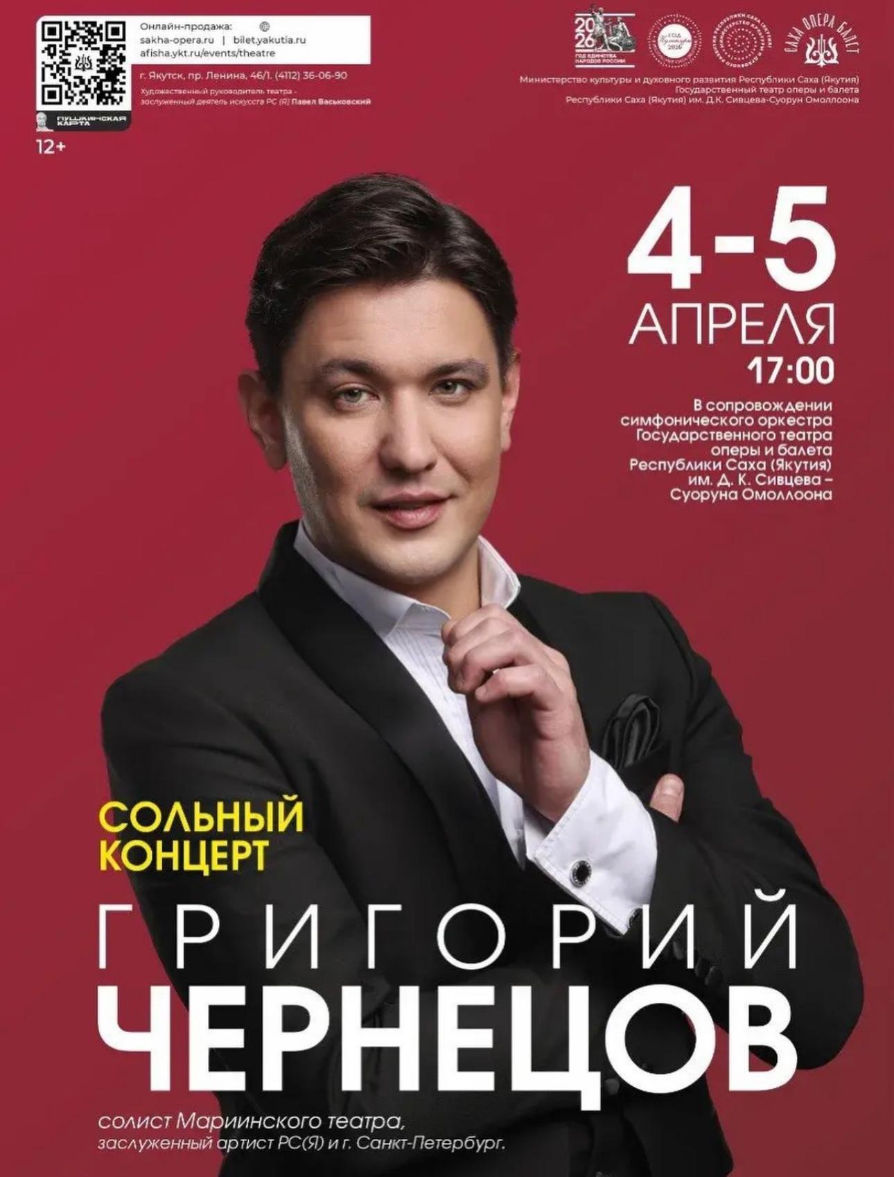 Солист Мариинского театра Григорий Чернецов даст концерты на сцене Якутского театра оперы и балета 4 и 5 апреля. Мероприятия предназначены для зрителей старше 12 лет.