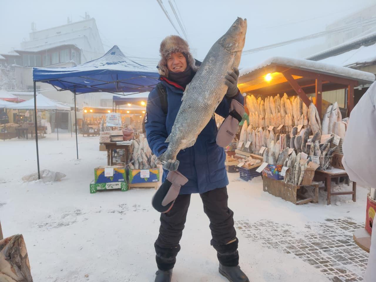 Стас Натанзон на Крестьянском рынке в Якутске с большой рыбой