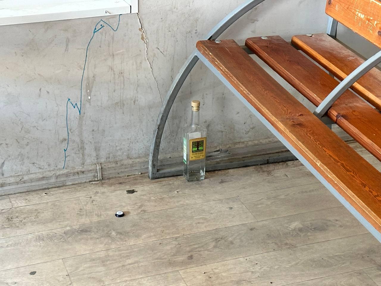 Бутылка из-под алкоголя на фоне загрязненной стены остановки «Жорницкого».
