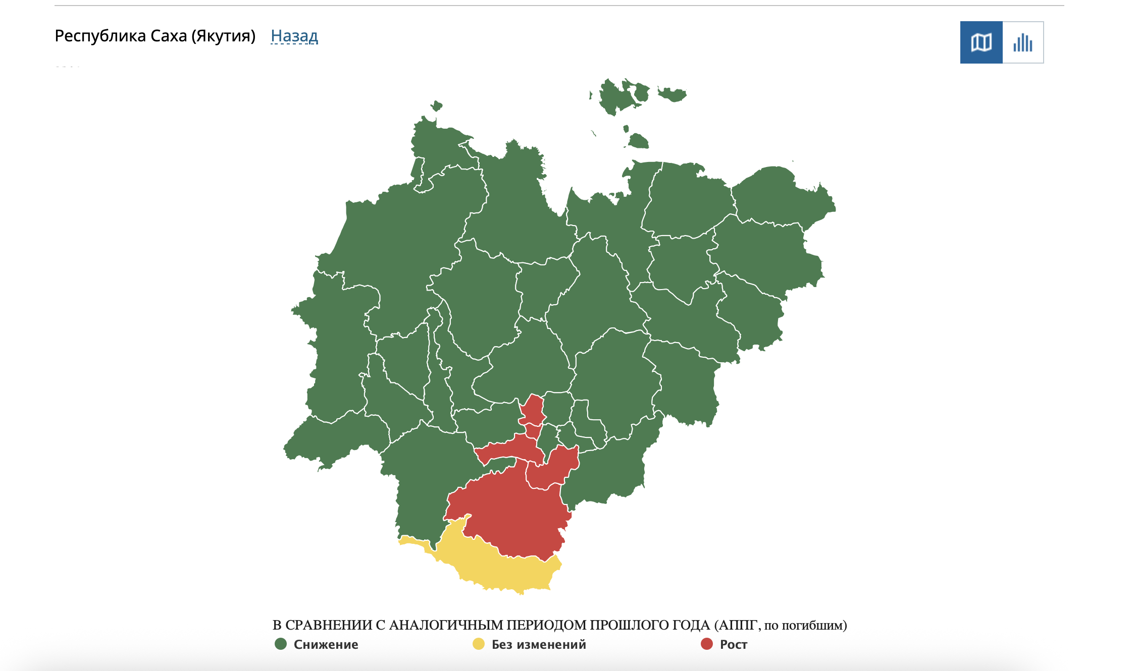 Наибольший рост смертельных ДТП, согласно данным Госавтоинспекции, зафиксирован в Хангаласском районе, где в семи авариях погибли четыре человека и восемь получили травмы. Следом идут Амгинский, Намский, Алданский районы и Якутск. В Нерюнгринском районе статистика осталась неизменной — одно ДТП с одним погибшим. В остальных районах республики количество аварий минимально, а на севере оно сведено к нулю.