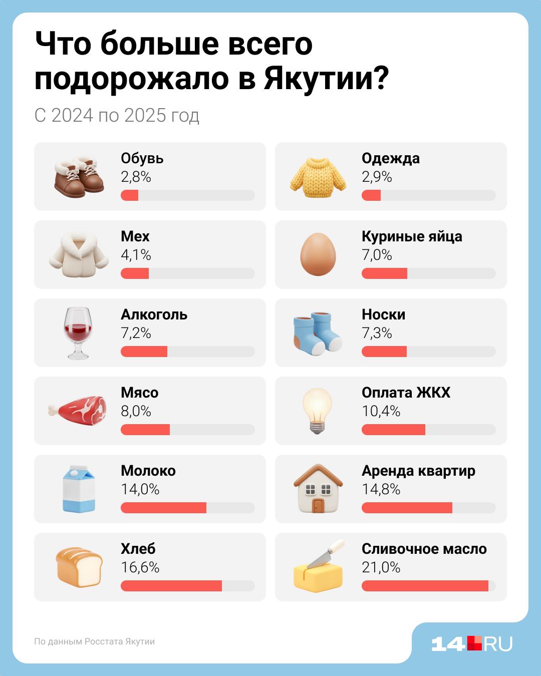 Согласно данным Росстата Республики Саха (Якутия), за период с 2024 по 2025 год цены на продукты питания в регионе выросли на 10,4%, если не учитывать овощи и фрукты. Стоимость последних увеличилась на 9%.