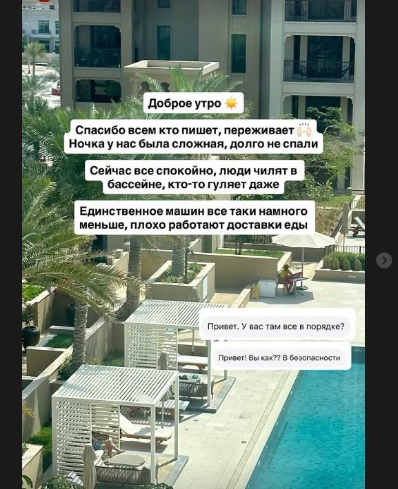«Сейчас везде небезопасно, а ОАЭ доказали: даже если неожиданно сбросить на страну столько ракет, они могу всех их ликвидировать. В других странах такой уверенности у меня бы не было. Тут новейшие системы ПВО. Мне кажется, суету наводят только туристы. Местные арабы с самого начала были „на чиле“, то есть они абсолютно спокойны. Ситуация сейчас стабильна, на дорогах много машин, все госорганы работают, я сейчас визу делаю сотруднику. Но информация об открытии рейсов еще не подтверждена», — пояснила она.